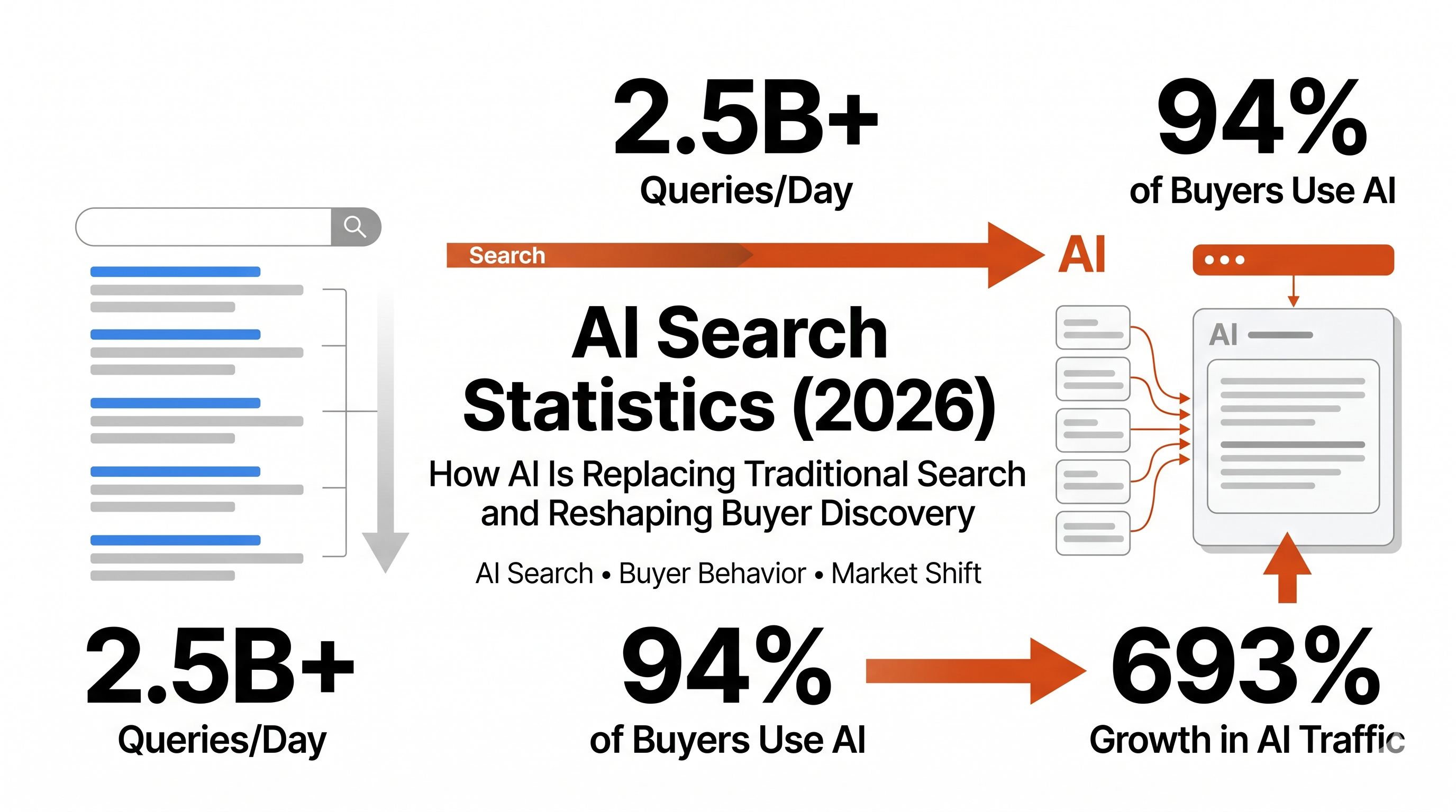 ChatGPT alone now processes 2.5 billion queries per day — and 94% of B2B buyers used a generative AI tool during their most recent purchase process (OpenAI, July 2025; 6sense, 2025 Buyer Experience Report). By the end of 2025, global adoption of generative AI tools reached 16.3% of the world's population, up from 15.1% in the first half of the year—a key trend shaping the digital landscape. The AI Search Engine Market was valued at approximately $18.84 billion in 2025 and is projected to exceed $50 billion by 2033, while the overall AI market is expected to reach a staggering $1,339 billion by 2030. AI is projected to contribute a 21% net increase to US GDP by 2030 and is expected to see an annual growth rate of 36.6% from 2023 to 2030, underscoring the future impact of this technology on society and the economy. These trends are not only transforming business and technology, but are also reshaping society and everyday life, as AI-powered search and voice assistants become increasingly integrated into daily routines. The question for B2B marketing teams in 2026 is not whether buyers are using AI search, it is whether your brand is being cited when they do. Gartner predicted traditional search engine volume would drop 25% by 2026 due to AI chatbots and virtual agents (Gartner, February 2024), and Adobe data shows AI-driven referral traffic to US retail sites surged 693% year over year during the 2025 holiday season (Adobe Digital Insights, January 2026). We aggregated data from OpenAI, Adobe Digital Insights, Gartner, 6sense, Similarweb, Conductor, SE Ranking, Ahrefs, SparkToro, and a dozen other primary and Tier 2 sources to compile the most comprehensive AI search statistics for 2026.
